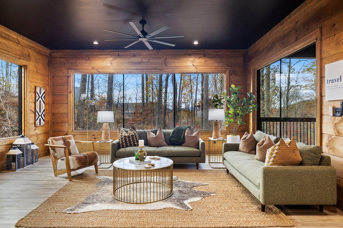 -Great Room: Spacious area with luxury furnishings, a cozy fireplace, and large windows