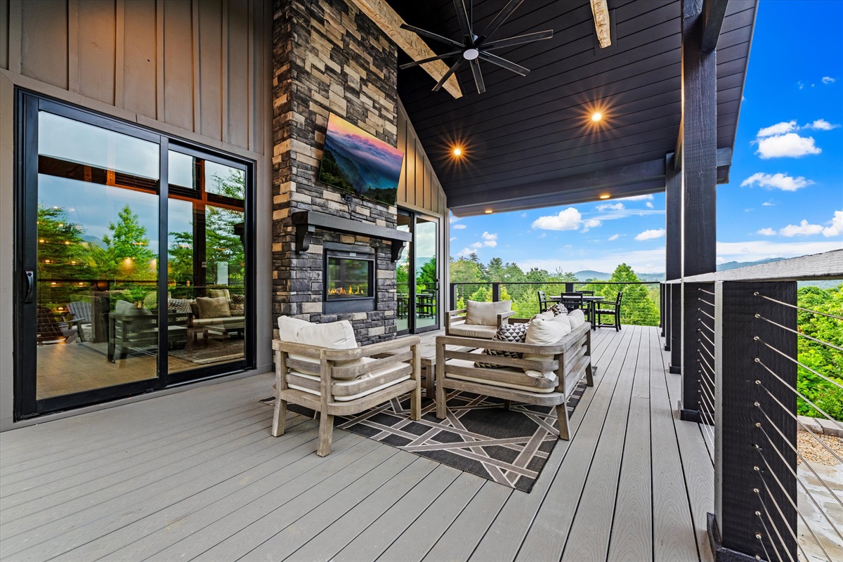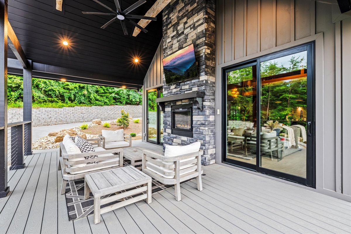 -Covered Outdoor Living Areas: Two covered decks, one featuring an outdoor fireplace. Please note that you will need to bring your own firewood. We do not supply it at the cabin.