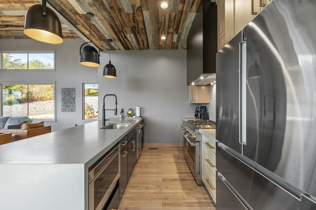 -Fully Equipped Kitchen: High-end kitchen with stainless steel appliances and bar seating.